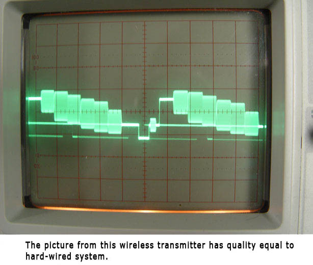 This is the special 2.4 GHz video transmitter-a high power unit. This transmitter was built using the latest technology. The size of this transmitter is just amazing: 0,5 X 0.5" X 0,12"exactly. Complete unit is built on high quality multi layer PC board. The picture is broadcast quality. This video transmitter has audio carrier and channel selector on board. You can transmit to 4 channels in 2.4 Ghz- 2.5 Ghz band.