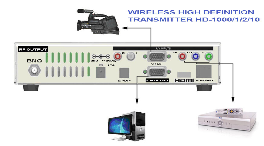 New Digital UHF Video Transmitter model HD-1000C is a fully synthesized audio/video transmitter for UHF band from 25 MHz-1000 MHz. It is a Commercial grade unit that covers the wide frequency range. The picture you can pick using any digital ready TV set. The RF power output power is 100 mW. It sends a crisp color picture and sound up to 500 ft. This transmitter will encode a single uncompressed program derived from devices with HDMI, Component Video or VGA outputs to HD MPEG2 video. It supports 480i, 480p, 720p and 1080i resolutions. This transmitter accepts Component Video signal, also it has built-in a Composite Video input, and VGA input as well.