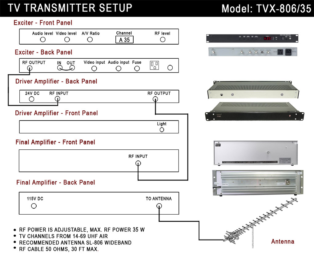 TV transmitter TVX-806 has been made for small TV studios and it has 2 W (Model TVX-806/2), 5W (Model TVX-806/5) -( new model) or 35 W (Model TVX-806/35). Fully professional this unit will send a perfect Color picture and sound. Antenna output is N- female type (BNC for TVX-806/2 model).Recommended antenna is Panel type - directional 11 dB gain for all UHF channels from CH 14- 69. Channel selection is external. The unit is thermal protected and with a VSWR protection as well. The range of this transmitter can be over 10 miles with antenna mounted at least 30 ft above ground. Antenna is not included in price.Please specify desired channel for the best performance.
